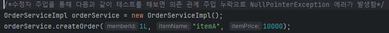 - 수정자 주입에서 테스트 할 때처럼 의존관계 주입을 누락시키는 경우 NullPointeException이 발생한다.