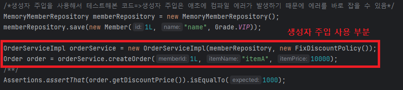 위와 같이 바로 컴파일 에러가 발생하기 때문에 실수로 의존성 주입을 빼먹을 일이 없다! (물론 의존성 주입을 안하고 싶거나 다른 이유 등으로 final을 붙이지 않으면 생성자에서 해당 필드를 주입시키지 않아도 에러가 발생하진 않음). 즉, 컴파일 에러만 잡아주면 잘 됨!! 테스트 코드로 확인해보겠다!