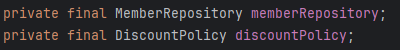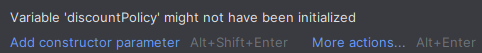 discountPolicy를 생성자를 통해서 의존성 주입하고자 final로 선언했는데 생성자에서 discountPolicy를 깜빡하고 주입을 시키지 않았다? 그럼 다음 코드의 모습이 되고 다음과 같은 컴파일 에러가 발생한다.